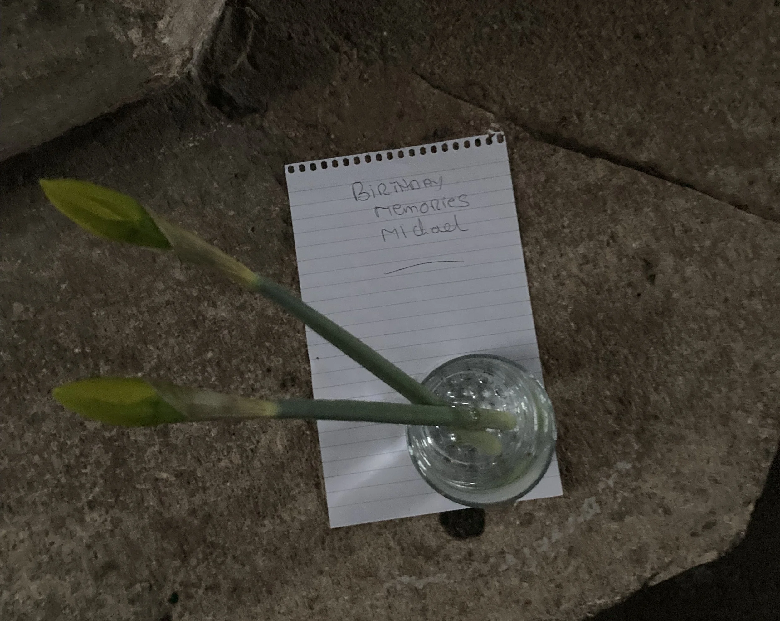 When she’d gone, I went over to the font where she’d left both paper and flowers. The message was long in loss and love though short in words. Just three of them in fact: “Birthday memories, Michael”…